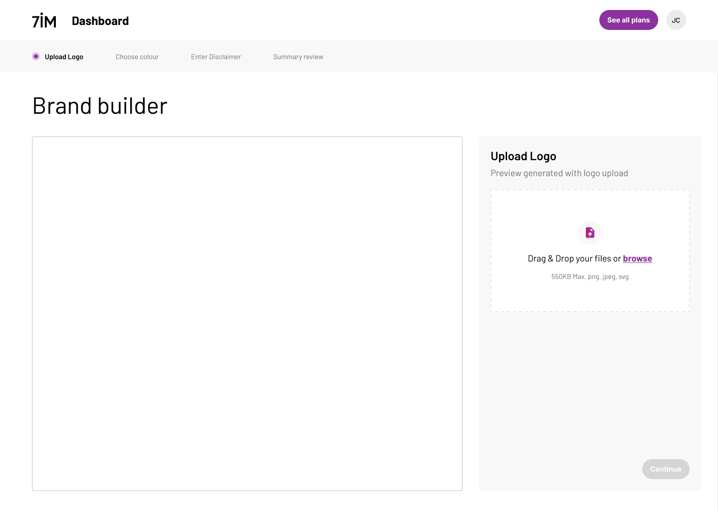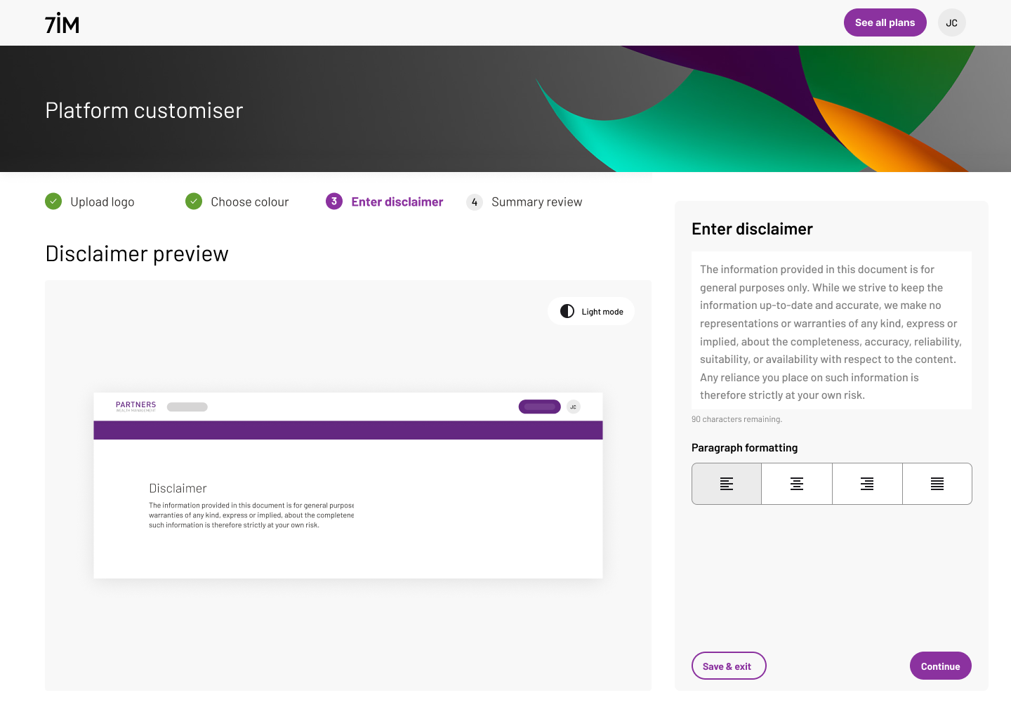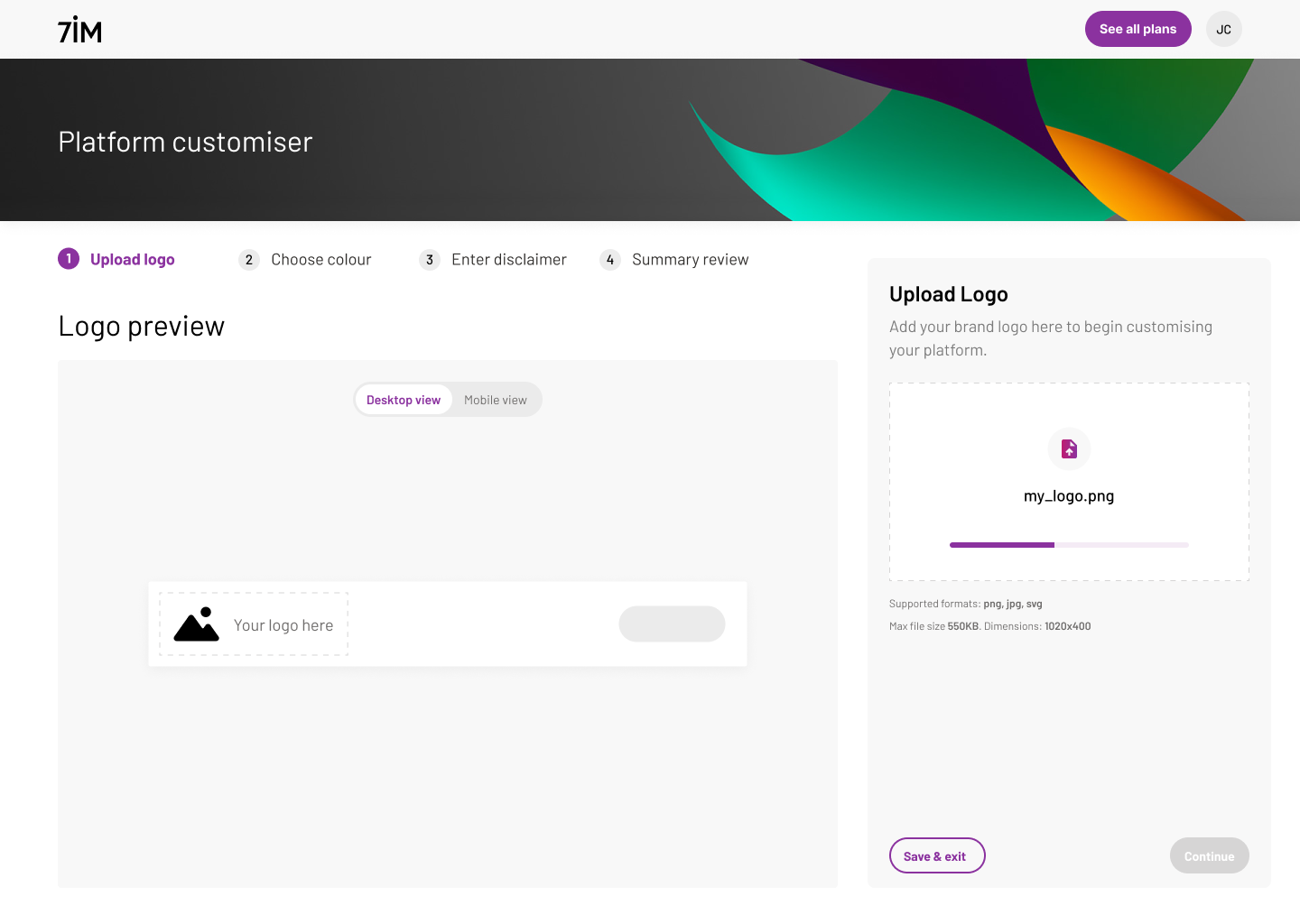 For the final design, we fully utilize 7IM’s existing design system to ensure consistency and seamless integration across the platform. We develop a white labeling product that allows 7IM’s clients to personalize the interface with their own branding—uploading logos, selecting colors, and previewing changes in real time. A key feature is the addition of a progress bar that guides users through the setup journey, helping them track how far they’ve come and clearly signaling when they’ve completed uploading all brand assets.m
