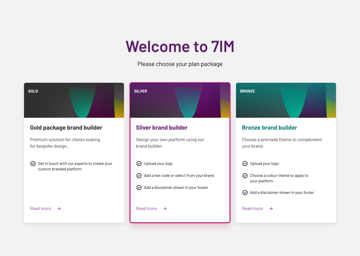 In this stage, we explore different ways of presenting 7IM’s pricing models, giving clients clear package choices for white-labeling their own platforms. Alongside that, we iterate on a dynamic logo editing tool—allowing subscribers to see how their own brand comes to life across layouts, preview screens, and interface elements in real time.