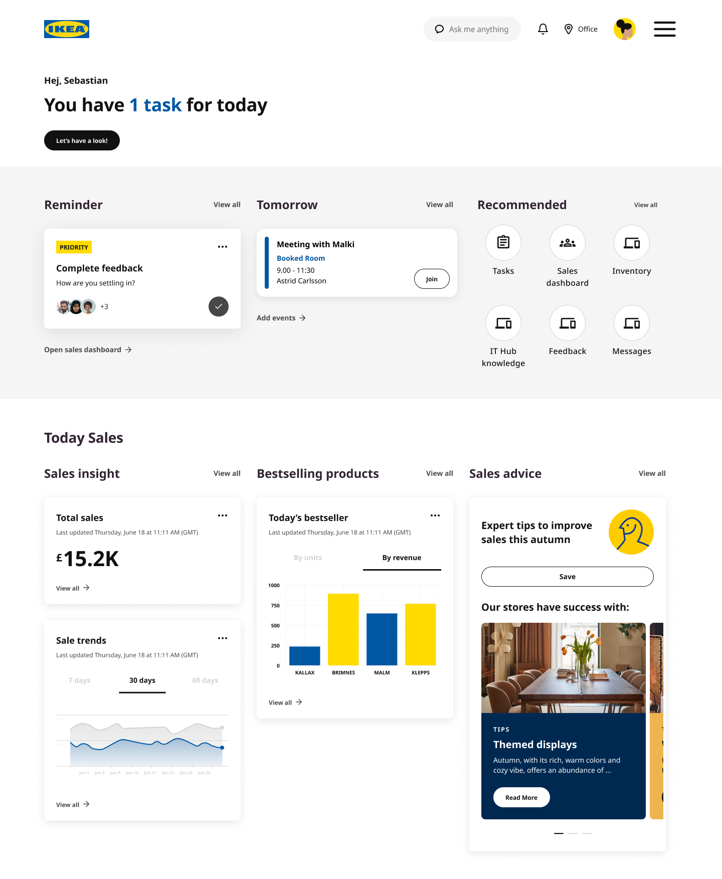 In the web-based version of the IKEA Superapp, co-workers log into their account on shared shop floor desktops using either credentials or a quick ID scan, ensuring fast, secure access to their personalized workspace. Once logged in, they are welcomed with a dashboard that mirrors the mobile app, surfacing real-time insights like total sales, top-performing products, and current store performance trends—giving them instant awareness of what’s happening in their department.