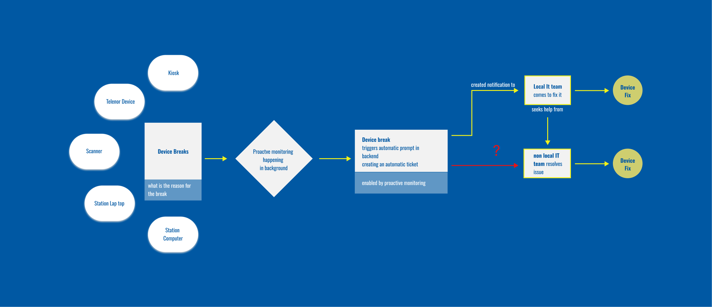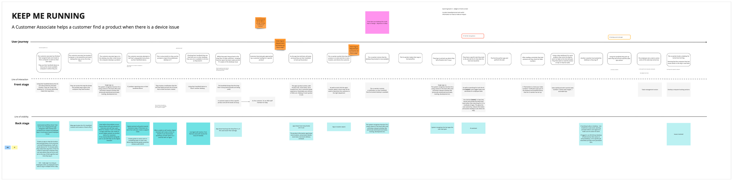 The resulting journey map captures one of those key flows—“Keep Me Running”—which illustrates the chain of events that unfold when a customer asks for help but the in-store devices are down. This journey is mapped across multiple swim lanes, tracking not only the employee’s user journey but also front-stage actions, backstage dependencies, and systemic interactions. By visualizing this end-to-end experience, the design team grounds its strategy in real-world constraints, helping define where digital interventions should prioritize speed, autonomy, and cross-device continuity to truly improve day-to-day service delivery.