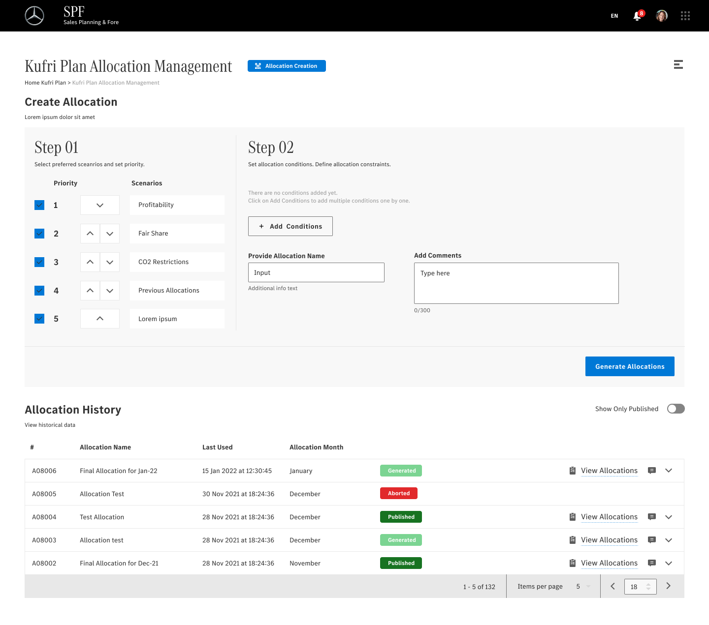 KUFRI (Customer Allocation Planning) supports strategic vehicle allocation and distribution planning across global markets. The platform enables business planners to configure and prioritize allocation methods such as profitability, fair share, and sales performance—each scenario offering a different logic for how vehicles are split across markets. Users create and name allocation plans, define conditions, and maintain a full allocation history, reinforcing transparency and consistency in the decision-making process.