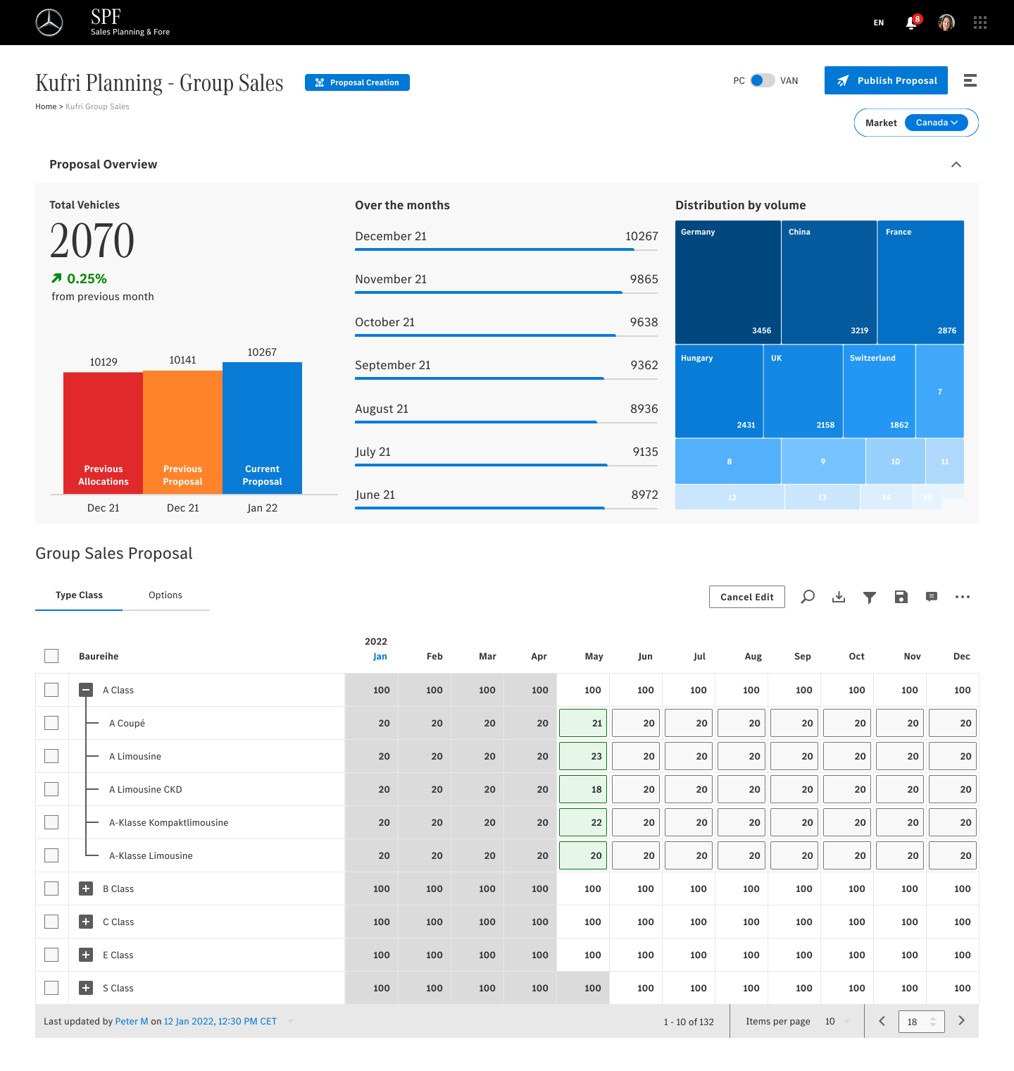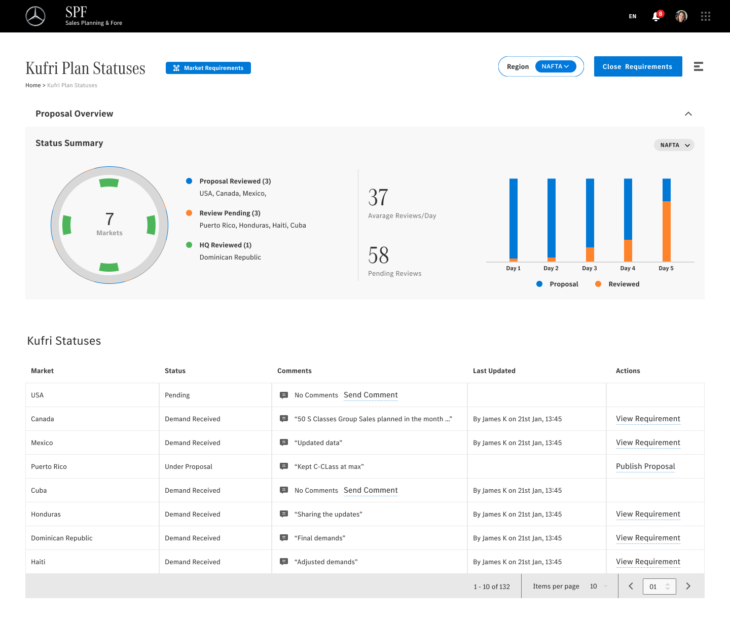 These dashboards summarize total vehicle proposals and visualize production requirements, plant capacity, and allocation breakdowns by region and volume. The system manages the full lifecycle of a proposal—from initial configuration and internal review to final publishing across specific markets such as the USA or Canada—while offering real-time updates, in-context commenting, and adjustment options. The status overview keeps all stakeholders aligned by tracking pending reviews and proposal statuses across regions, helping to surface bottlenecks and drive coordinated actions. Rather than a single feature, KUFRI functions as a modular, data-driven ecosystem that connects market demand with production planning in a clear, auditable, and efficient way.