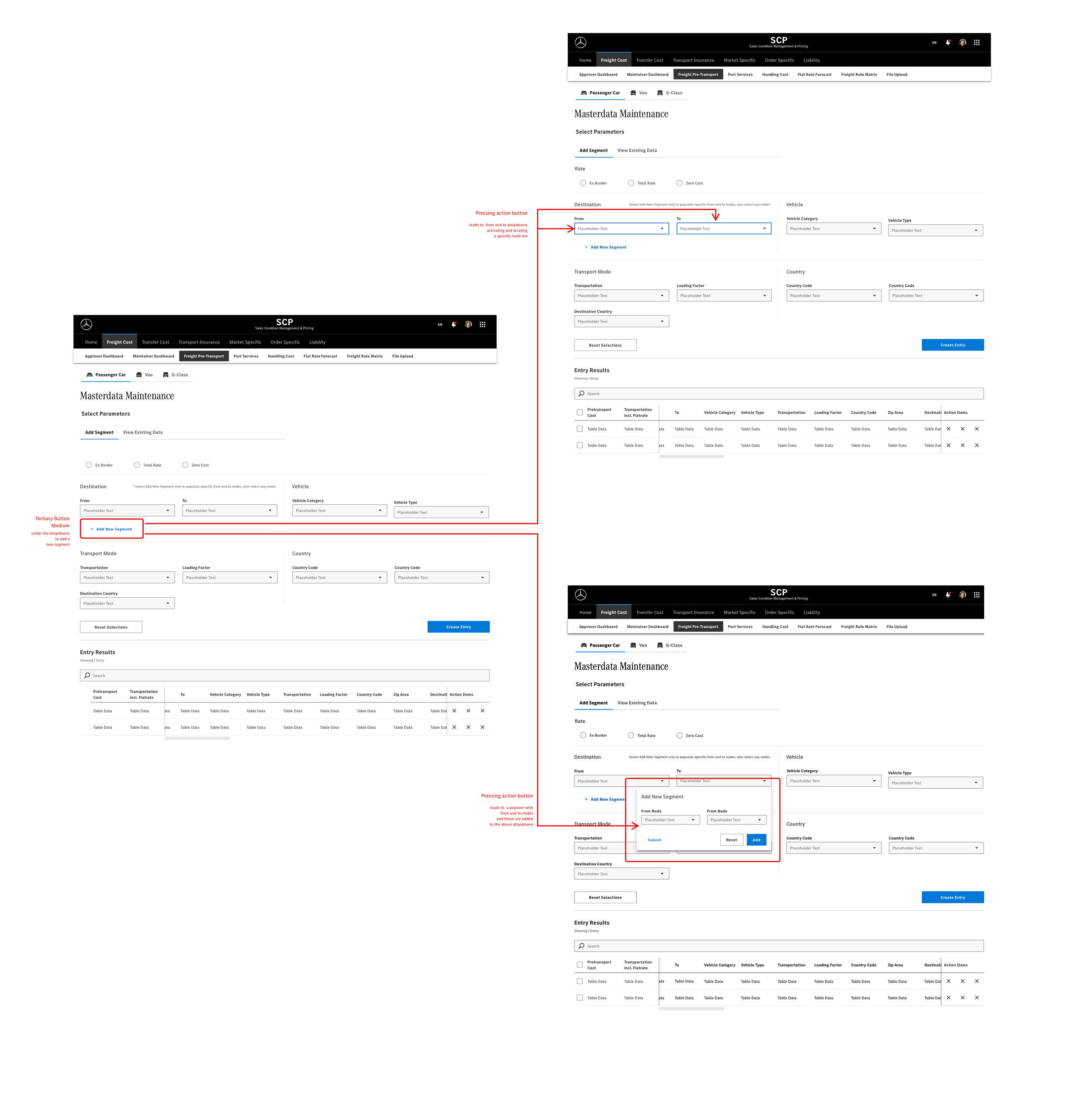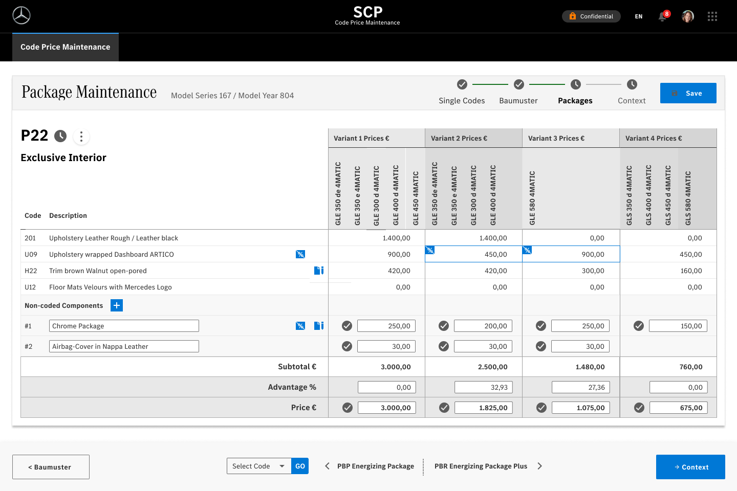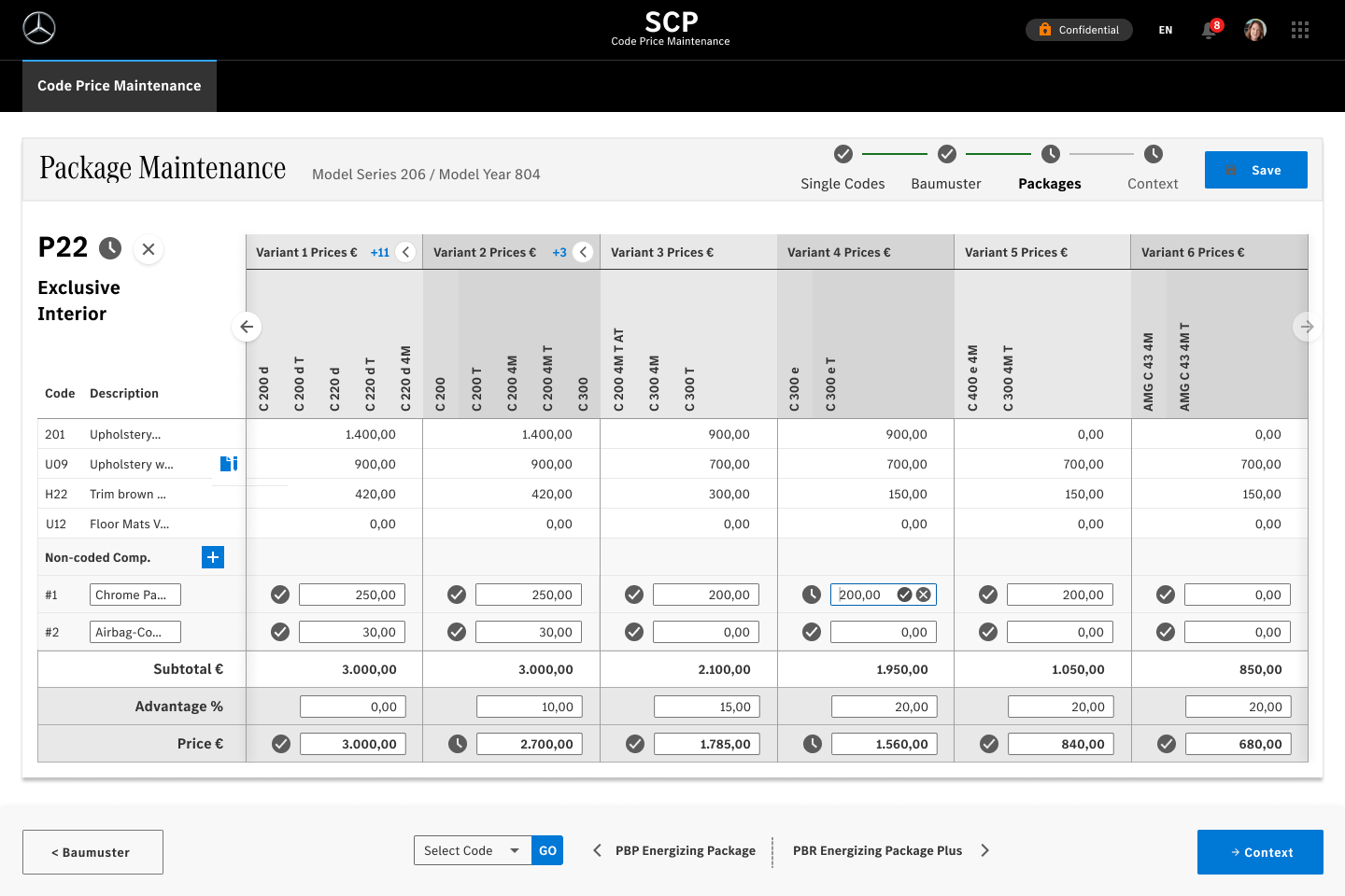 These PRC (Price Creation) screens show a highly detailed internal tool that supports Mercedes-Benz teams in maintaining and updating package pricing data across various car models and variants. Each screen represents a different stage in editing or checking how specific features or packages—such as interior materials or add-ons—are priced across vehicle variants for a given model year. The interface allows for cross-referencing and batch editing of pricing information, ensuring consistency and transparency across multiple markets. Our goal here is to create a clear, structured experience where users can accurately adjust pricing with reduced friction and minimal risk of error, especially during the critical process of launching or updating new vehicle models.